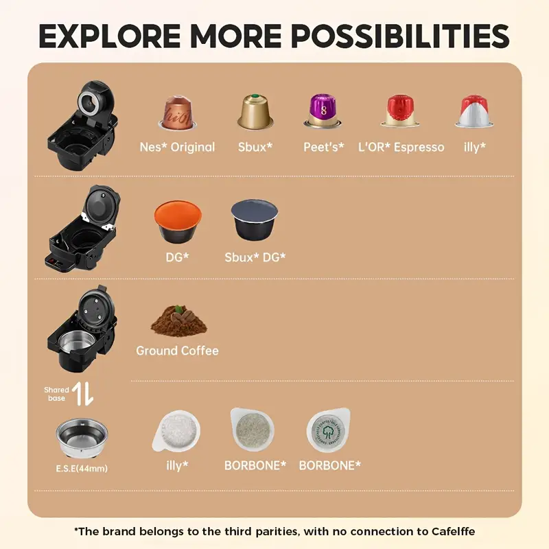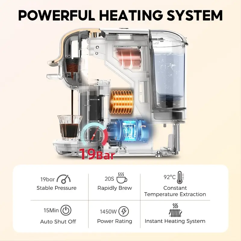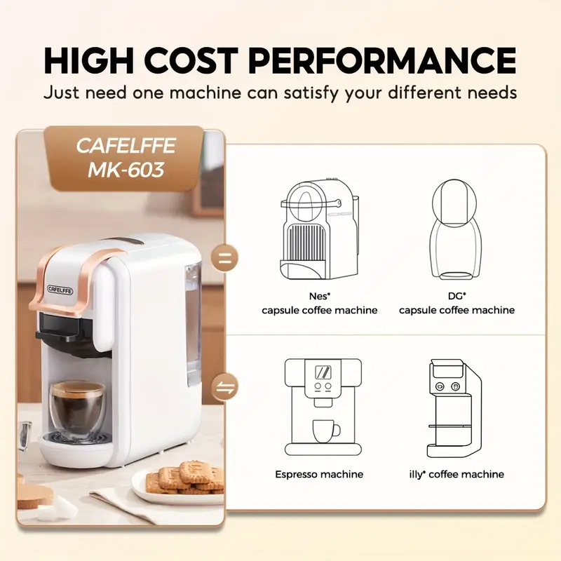 CAFELFFE 4 In 1 Capsule Coffee Maker MK603, Hot/Cold Brew Espresso Machine, 19Bar, Suitable For Nec* Capsules, DG* Capsules, ESE And Coffee Powder, Easy To Clean, Rust-proof, 0.6L Removable Water Tank, Suitable For Home Kitchen And Gift Giving